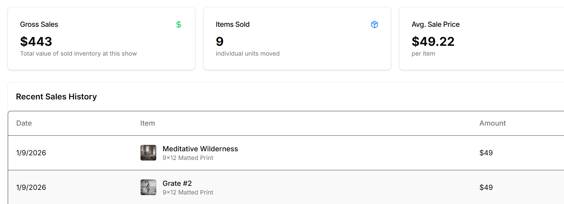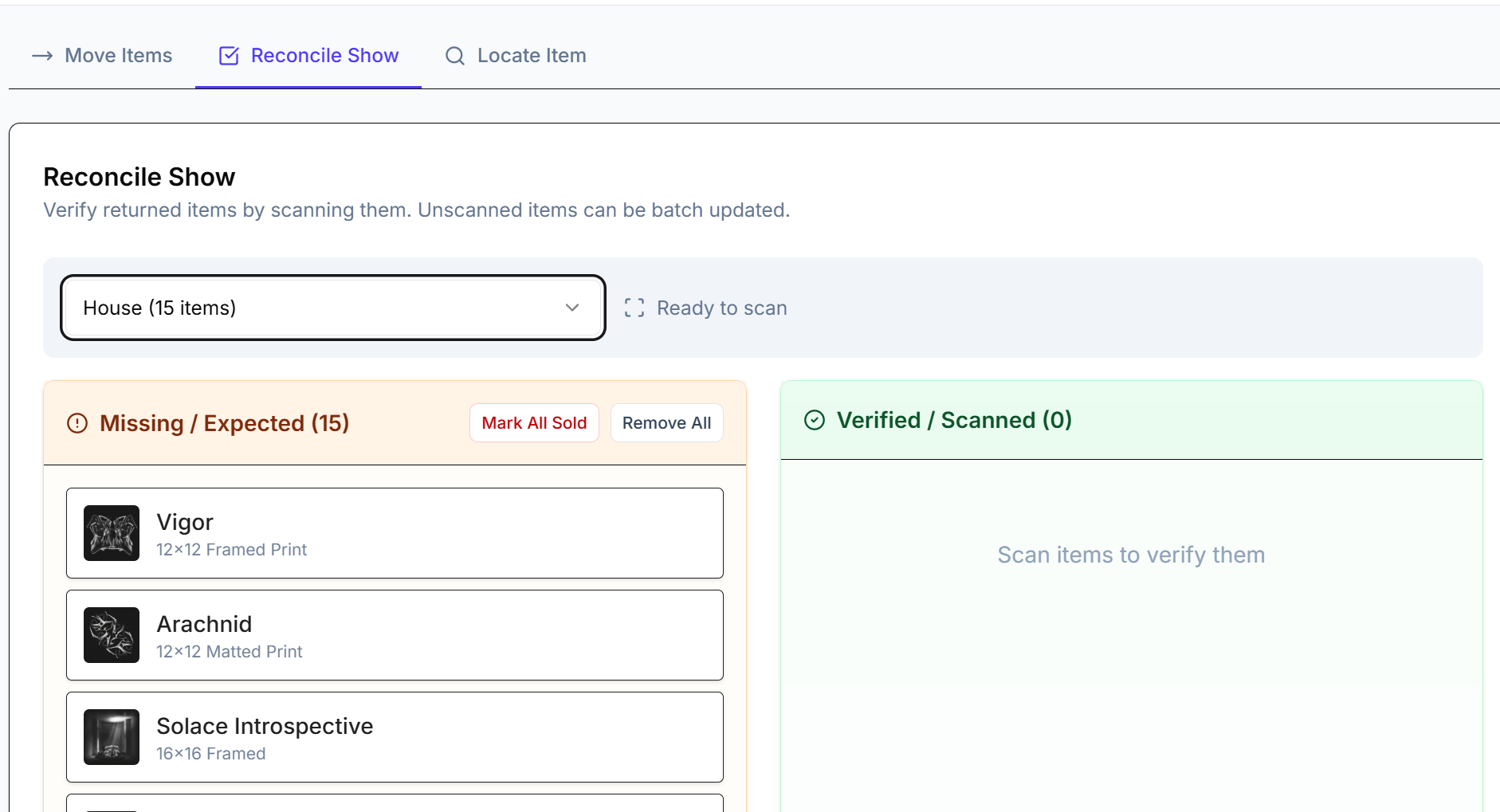 As an artist myself, the show reconciliation feature is simply amazing - if I am shipping art to a show, or doing an art fair and not keeping track of my sales real time (also a feature we offer) - I can scan my artwork after the show to determine what I have and what I have sold.